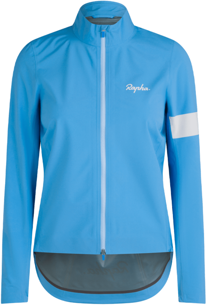 Made of a waterproof yet lightweight fabricRapha Core Women's Cycling Rain Jacket II is the ideal outer layer for rides with a chance of rain and wind. It easily folds down small to comfortably fit in your back pocket — always ready to be whipped out when it starts to rain or the winds gets up.